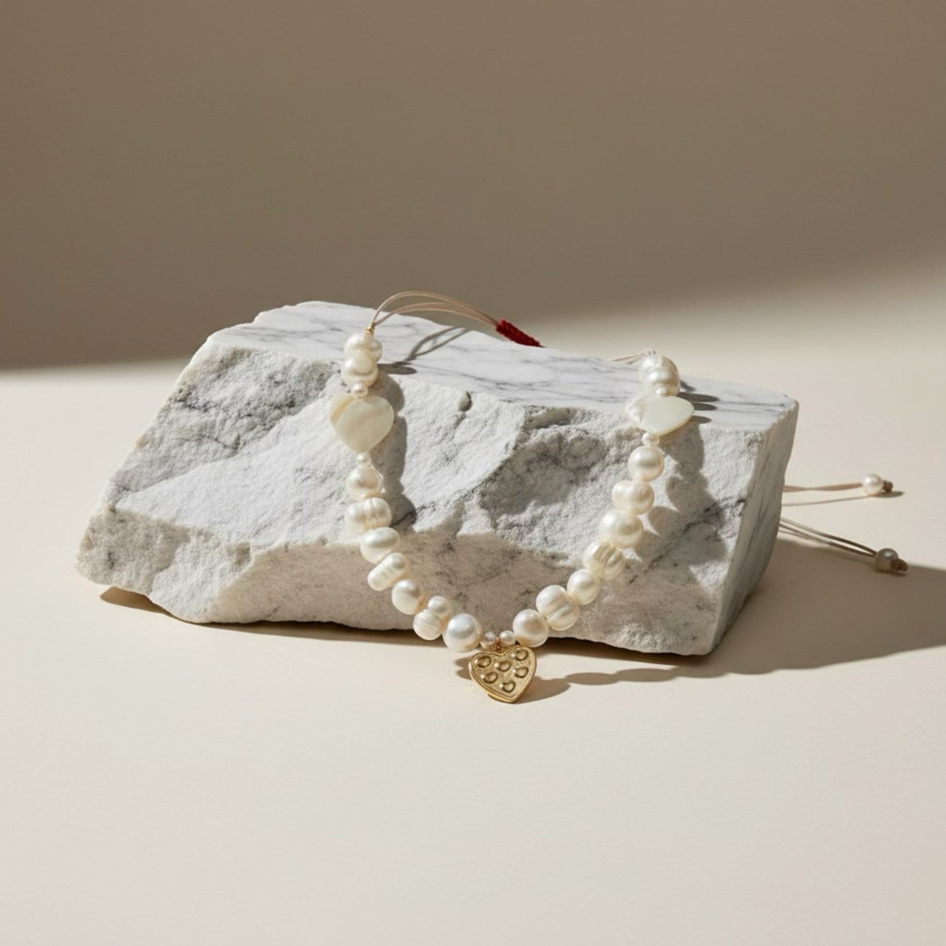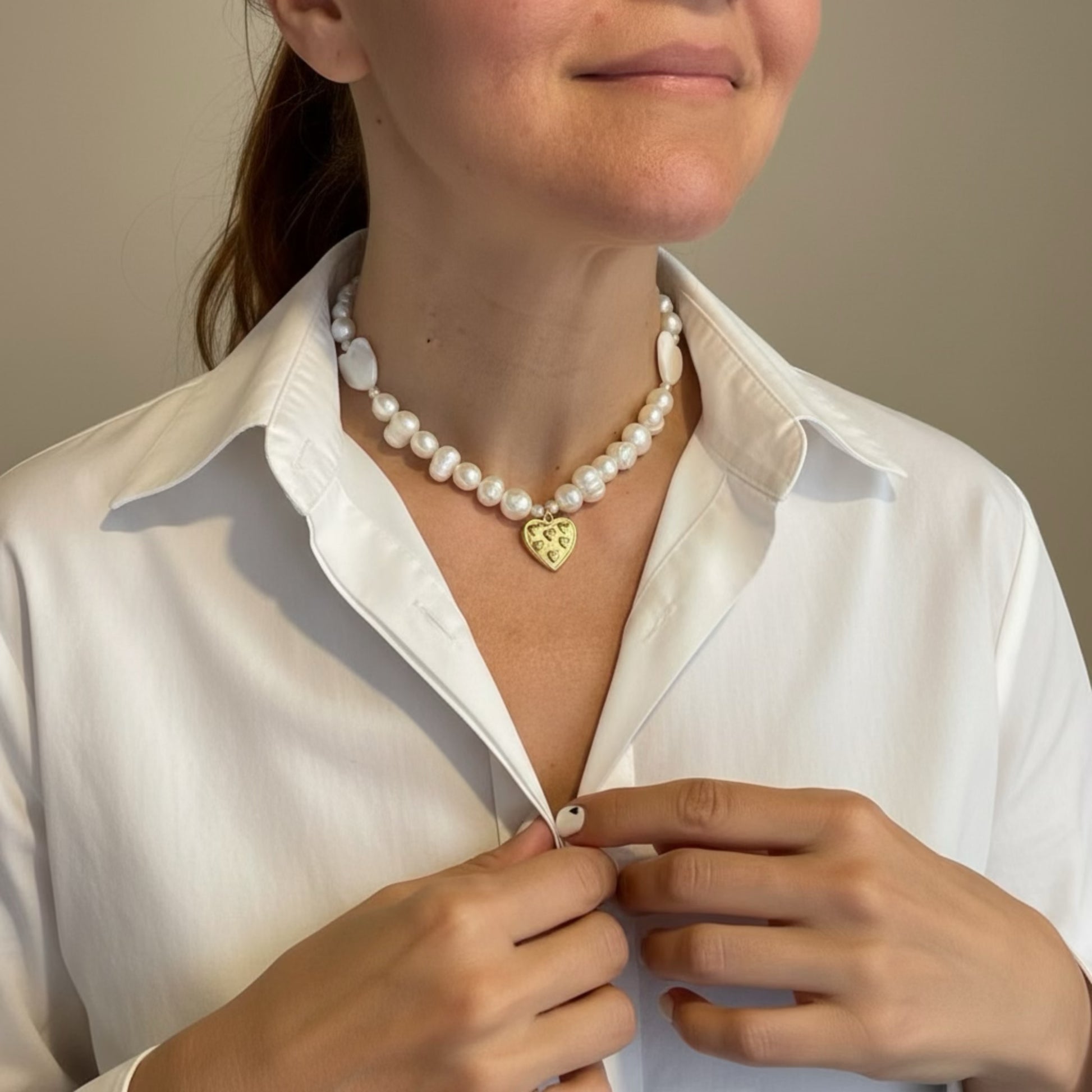 Elevate your everyday style with this handcrafted necklace featuring lustrous freshwater pearls paired with delicate nacre hearts and a golden-tone stainless steel heart pendant. The adjustable design ensures a perfect fit for any occasion, while the limited-quantity craftsmanship guarantees exclusivity. Each piece combines timeless pearl sophistication with romantic heart accents, creating a versatile accessory that transitions seamlessly from day to evening wear.