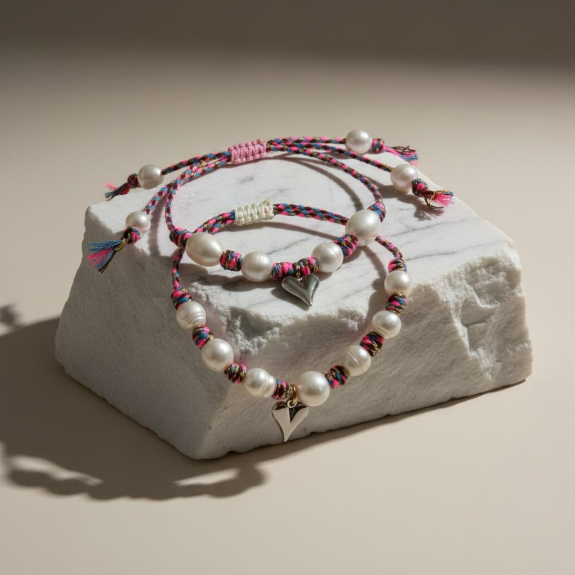 Meet your new go-to accessory duo. This Signature Pearls set includes two adjustable bracelets with knotted freshwater pearls on a multihued (pink, blue, brown, and gold) nylon, each topped with a silver-tone stainless steel heart pendant. Handcrafted in limited quantities, they're designed to mix, match, and layer with ease. Effortless sophistication.