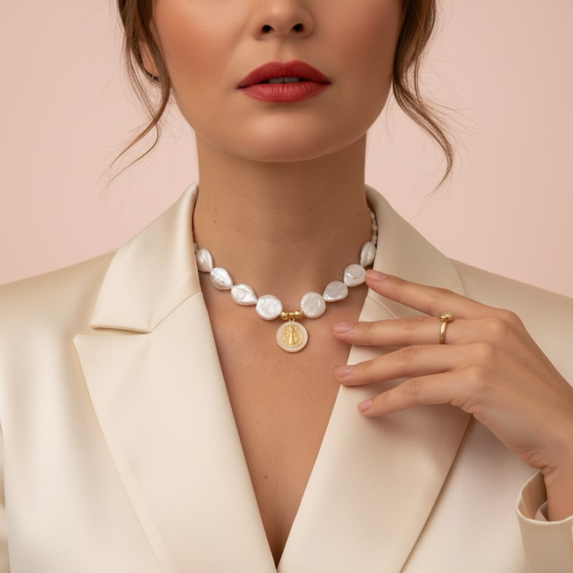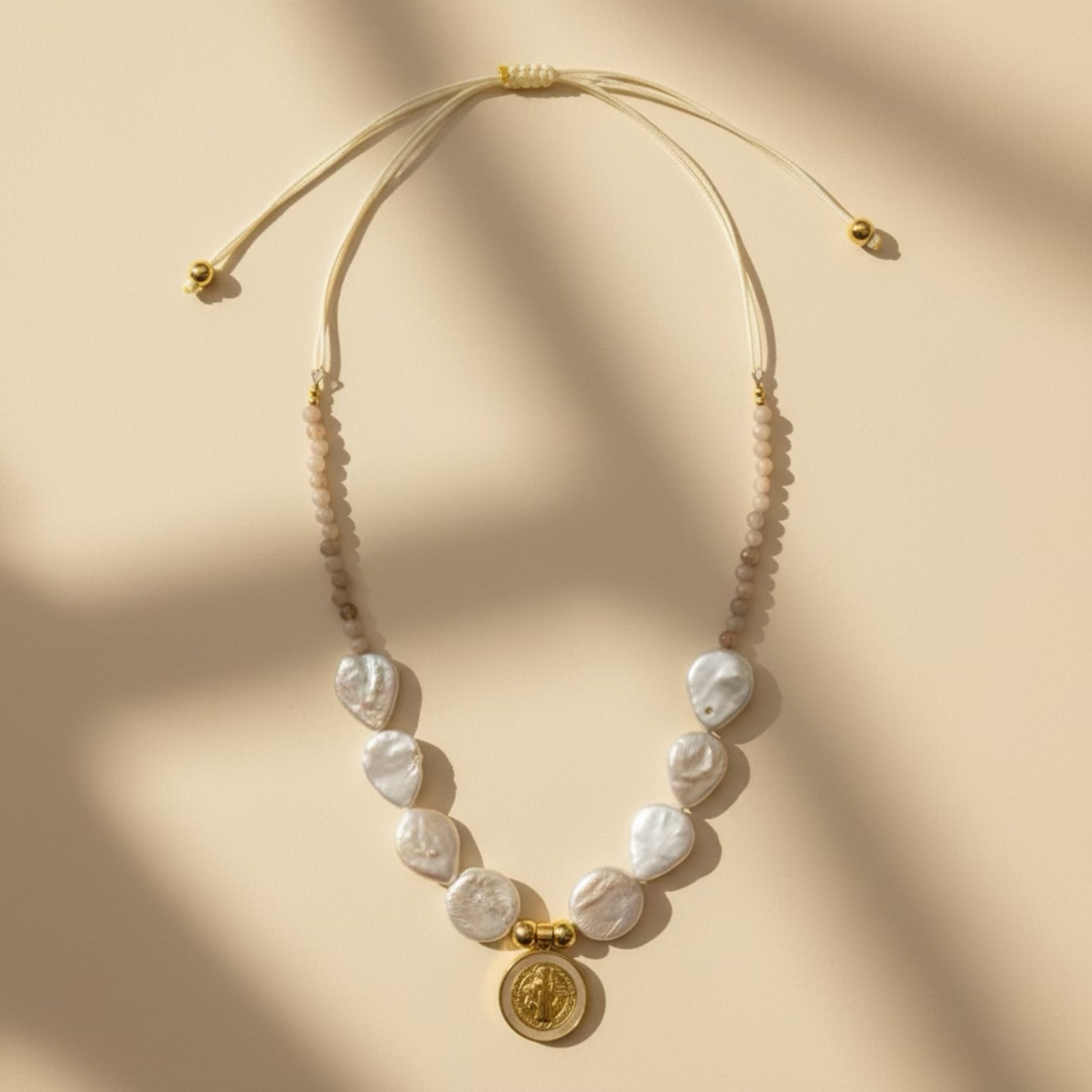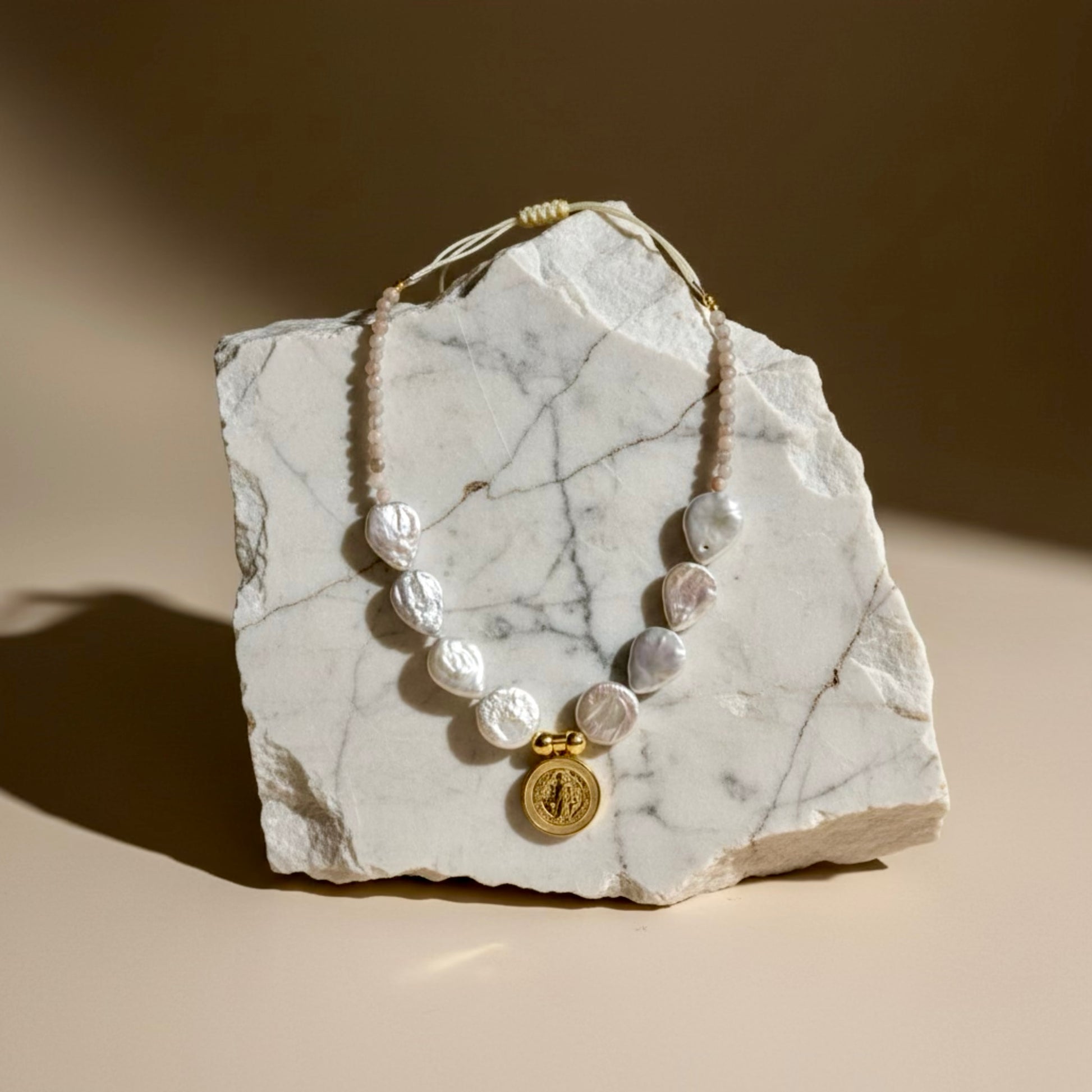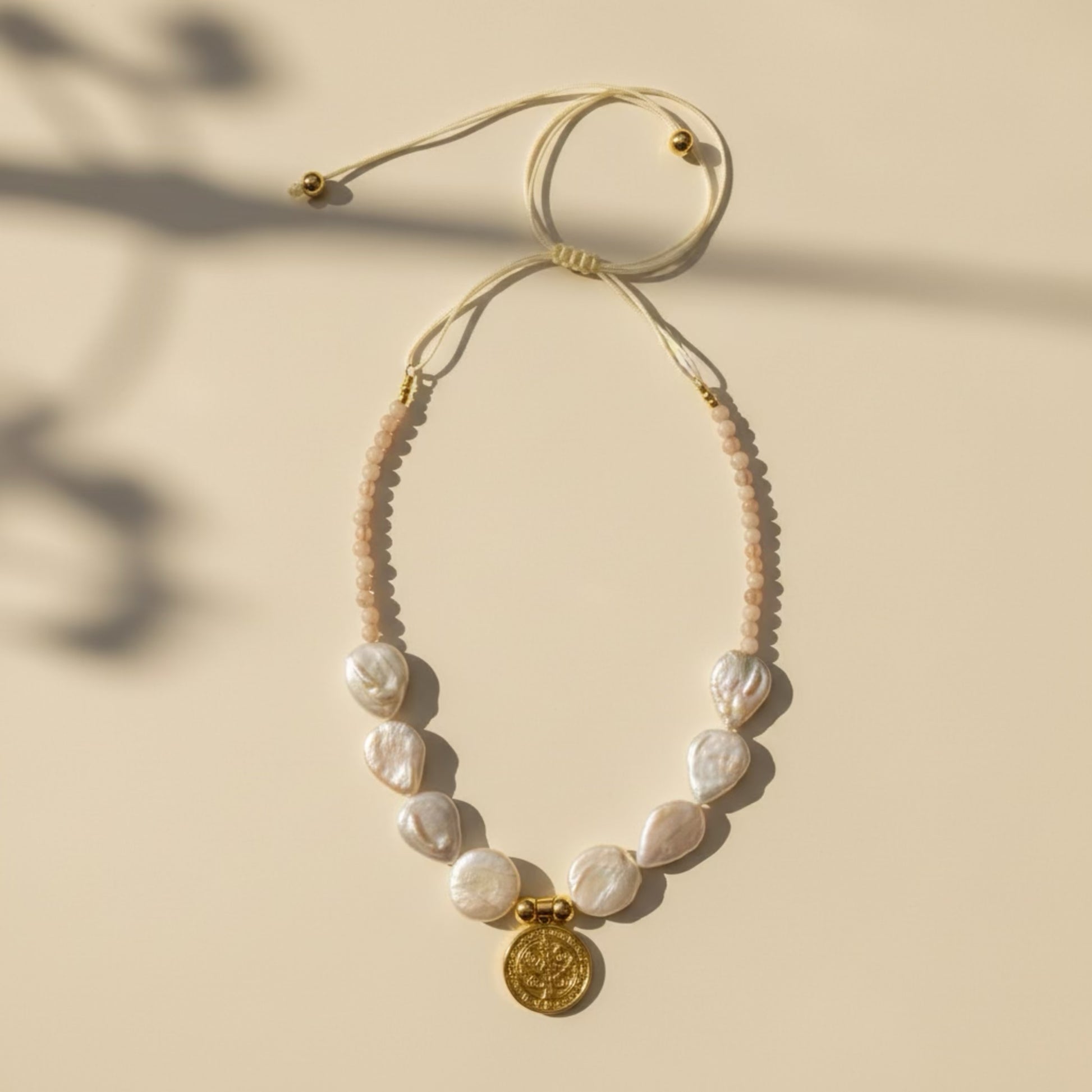 Discover timeless elegance with Heartbound Pearls, a handcrafted necklace featuring lustrous coin and drop freshwater pearls paired with a reversible San Benito nacre pendant. The adjustable design adapts to your style, while the reversible pendant offers versatility for any occasion. Each piece is meticulously created in limited quantities, ensuring exclusivity and artisanal quality. A sophisticated investment in enduring beauty.