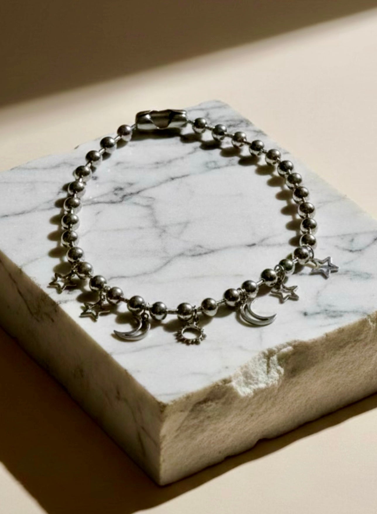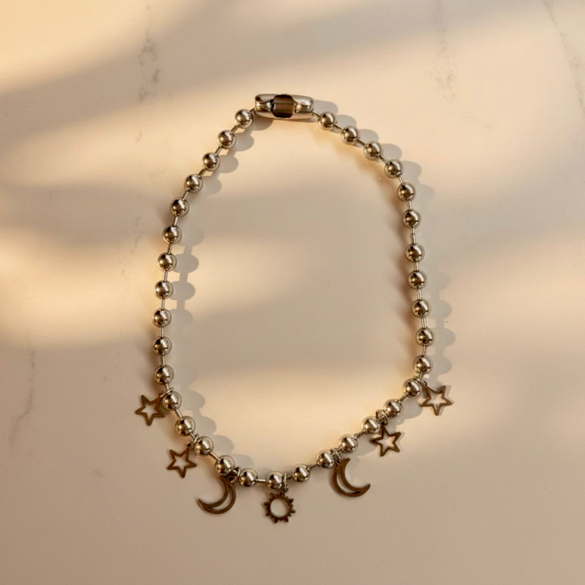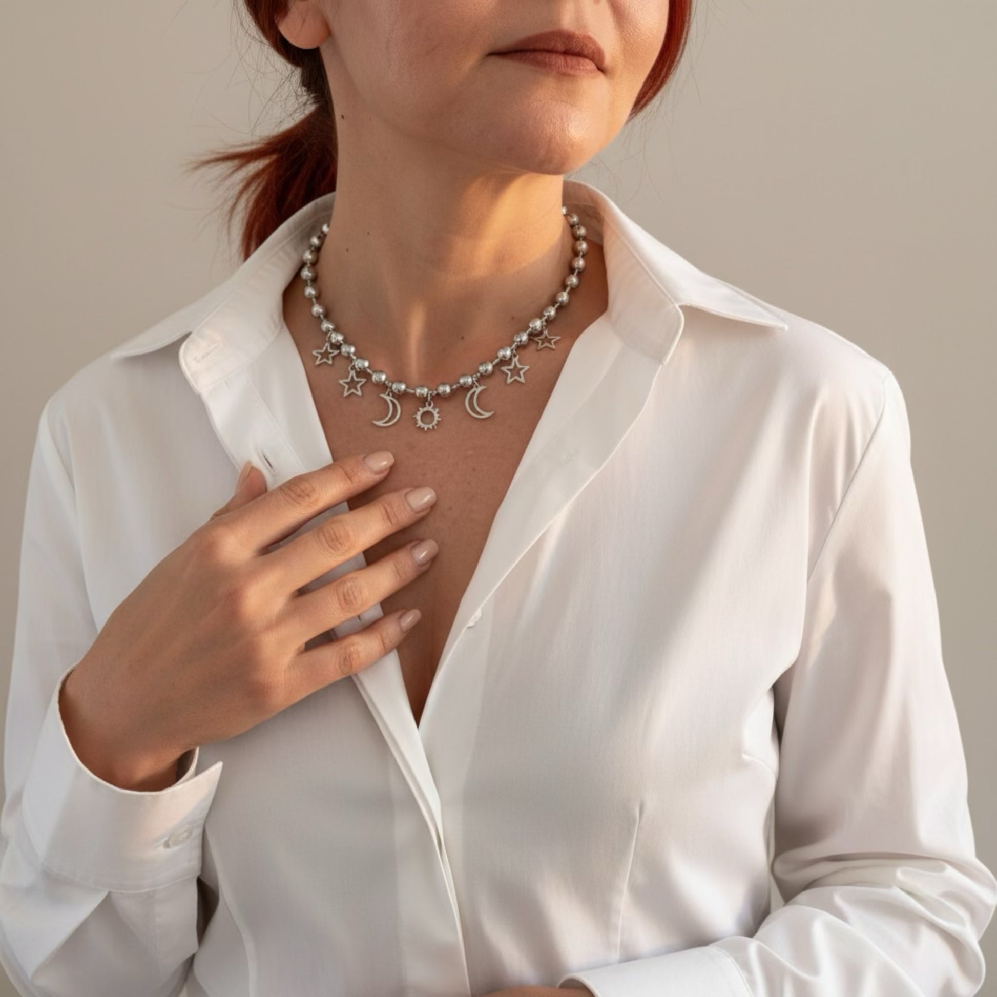 Celestial elegance meets everyday style with this stunning stainless steel pendant necklace. Featuring a captivating sun, moon, and star design paired with a refined beaded chain, this piece transforms any outfit into something special. Whether you're dressing up for an occasion or adding a touch of cosmic charm to casual looks, this versatile necklace complements any wardrobe. Let the timeless symbolism of the heavens inspire your personal style—a meaningful accessory that's as practical as it is beautiful.